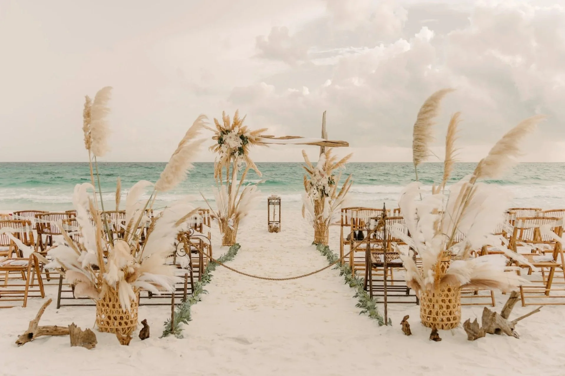 A boho-inspired beach ceremony, layered with natural textures, neutral tones and intentional design, creating a serene and enchanting atmosphere.